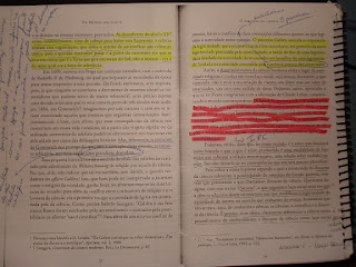 Mais do que sublinhar, às vezes também escrevo do lado do livro para ligar um ponto com outro, do mesmo capítulo, livro, ou ainda de outra coisa que estou estudando, ou que simplesmente vi em algum lugar.